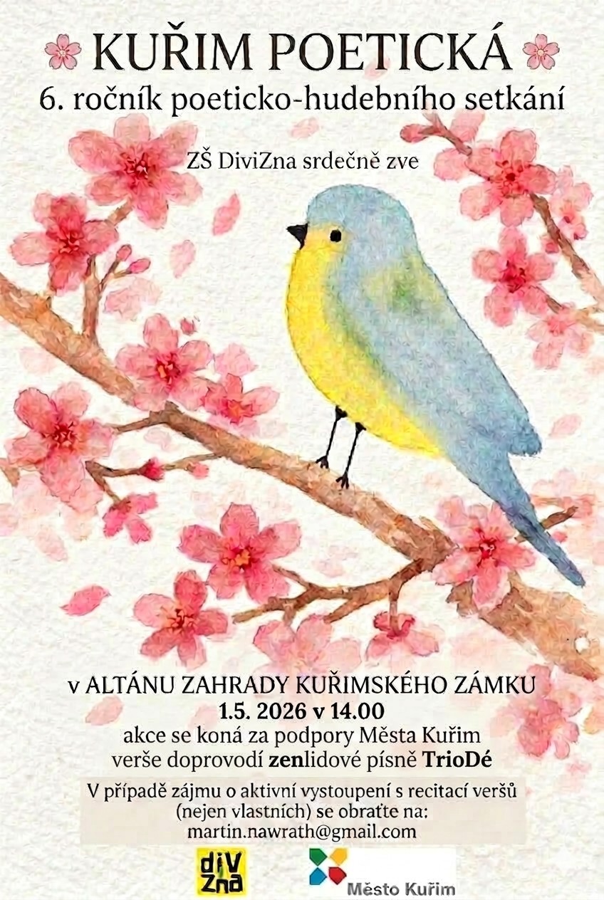 Základní škola DiviZna vás srdečně zve na poeticko-hudební odpoledne v malebném prostředí kuřimského zámku. Přijďte se zaposlouchat do veršů a nechat se unést tóny hudby v rozkvetlé zahradě.