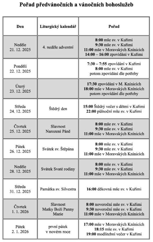 Přehled hlavních vánočních obřadů ve farním kostele sv. Maří Magdaleny v Kuřimi a filiálním kostele sv. Markéty v Moravských Knínicích.