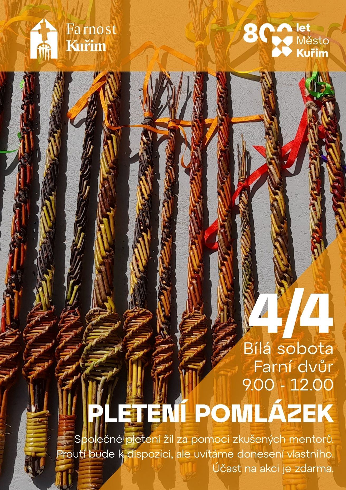 Zveme všechny chlapce a chlapi na velikonoční pletení žil na Bílou sobotu 4. dubna 9:00 - 12:00 na kuřimskou faru. Akce je letos ve spolupráci s městem v rámci výročí 800 let Kuřimi. Na akci budou připraveni mentoři, kteří vám rádi s pletením pomůžou nebo poradí. Proutků bude také dostatek.Těšíme se na vás!