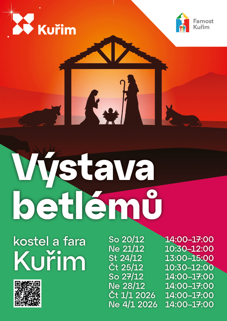 6. ročník tradiční výstavy betlémů v kuřimském kostele a nově i na faře. Můžete se těšit na betlémy od uznávaných betlemářů, doplněné o betlémy vytvořené v základních a mateřských školách v Kuřimi a blízkém okolí a betlémy od kuřimských občanů a spolků. Velkou novinkou je výstava na faře, která má název „Betlémy ze sbírky Zdeňka Jílka a jeho přátel“. Další velkou novinkou je separátní akce s názvem "Pojďme spolu do Betléma ulicemi Kuřimi"